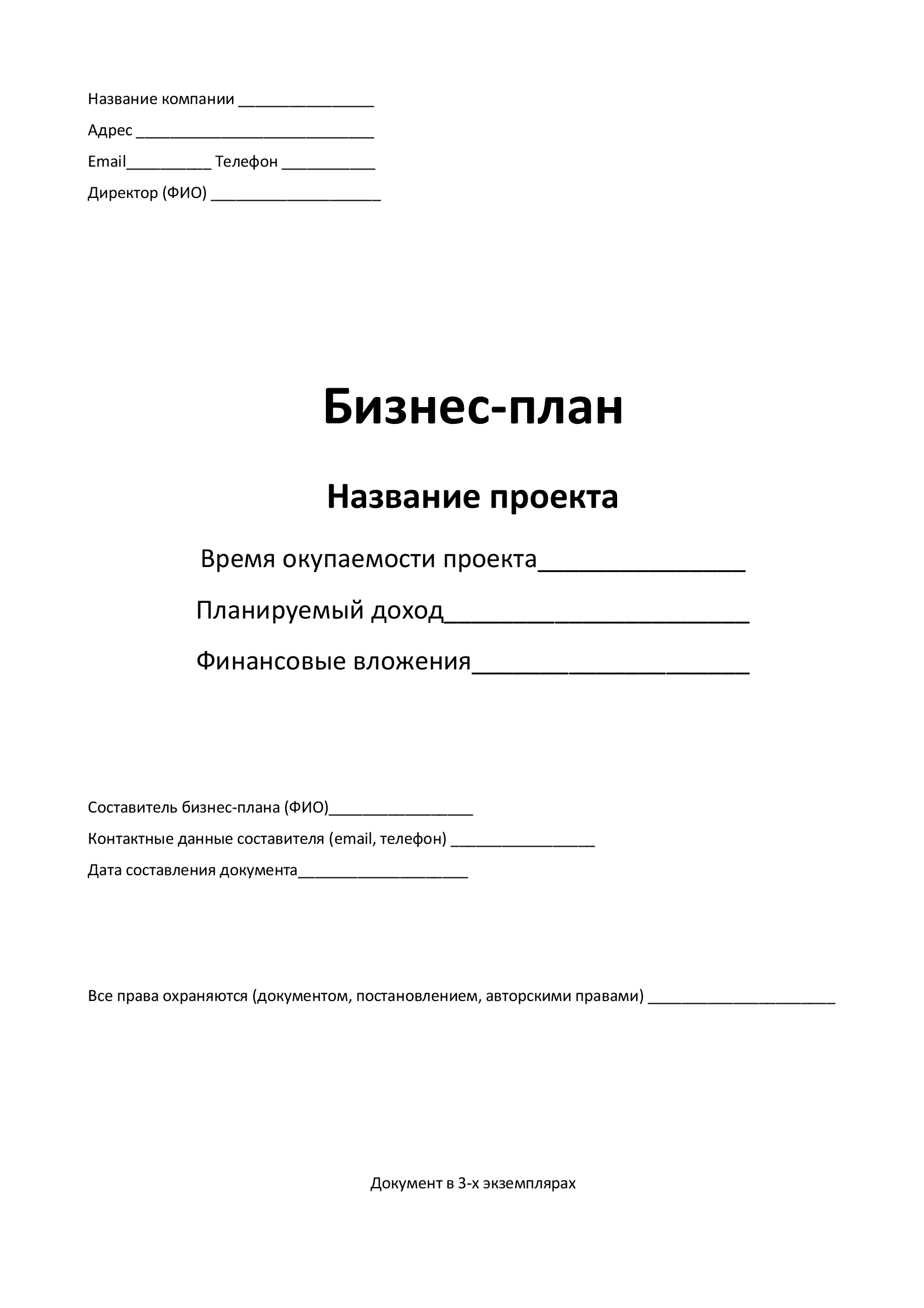 Титульный лист: Название бизнес-плана, дата, имя составителя, контактная информация.
