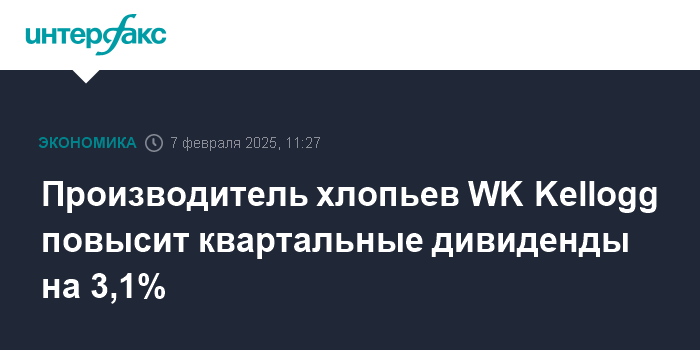 Американский производитель продуктов питания WK Kellogg повысит квартальные дивиденды на 3,1% — до 16,5 цента на акцию...