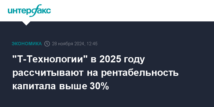МКПАО «Т-Технологии» в 2025 году рассчитывают на рентабельность капитала (ROE) свыше 30%, сообщил финансовый директор группы Илья...